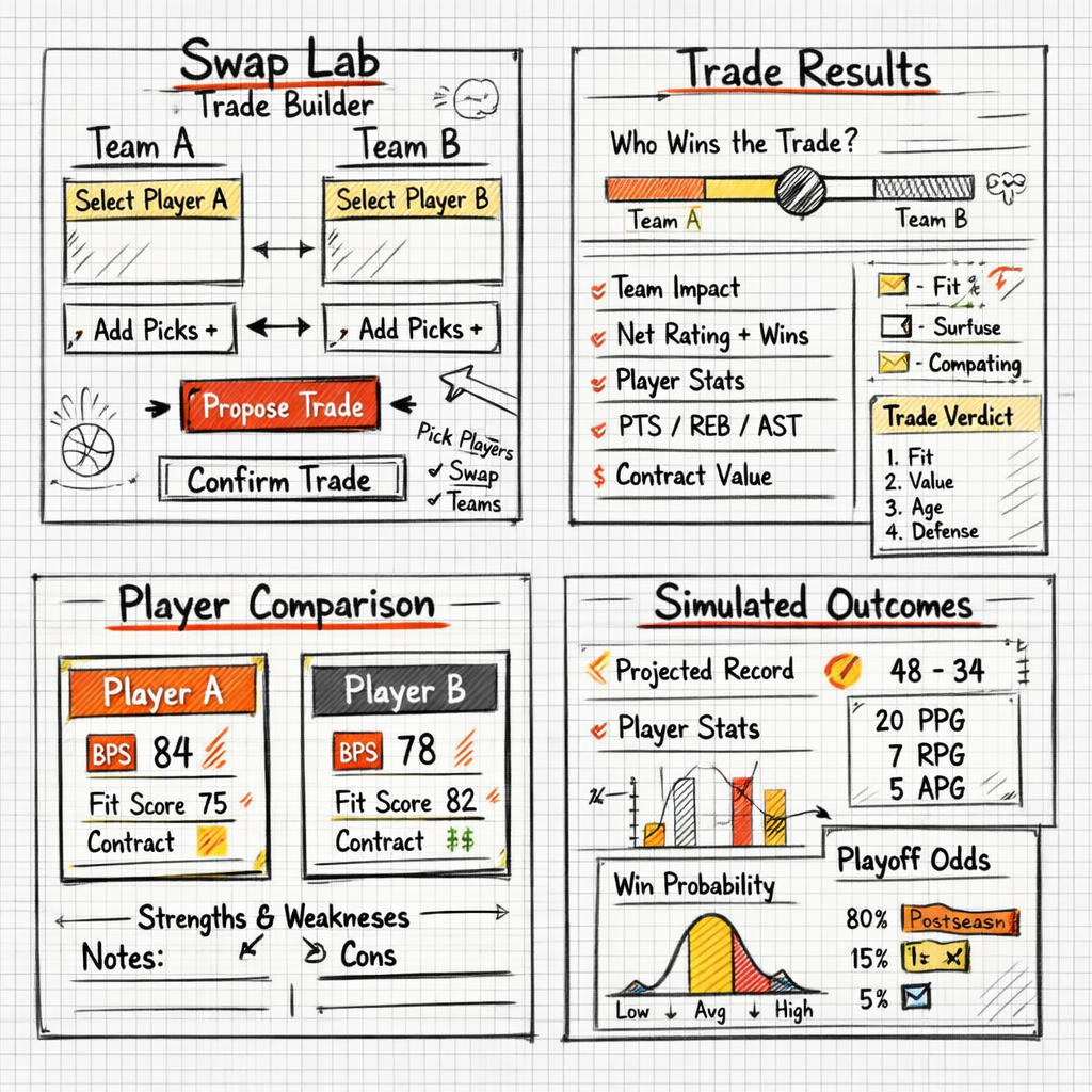 Swap Lab is a player comparison and trade-scenario tool that lets users evaluate two, for example, NBA players side-by-side and simulate “swap” outcomes between teams. It combines traditional and advanced stats with role/context indicators helping users judge roster fit, strengths/weaknesses, and projected impact in a visual, debate-friendly format. The experience is designed to make hypothetical trades feel structured, data-backed, and easy to understand at a glance.