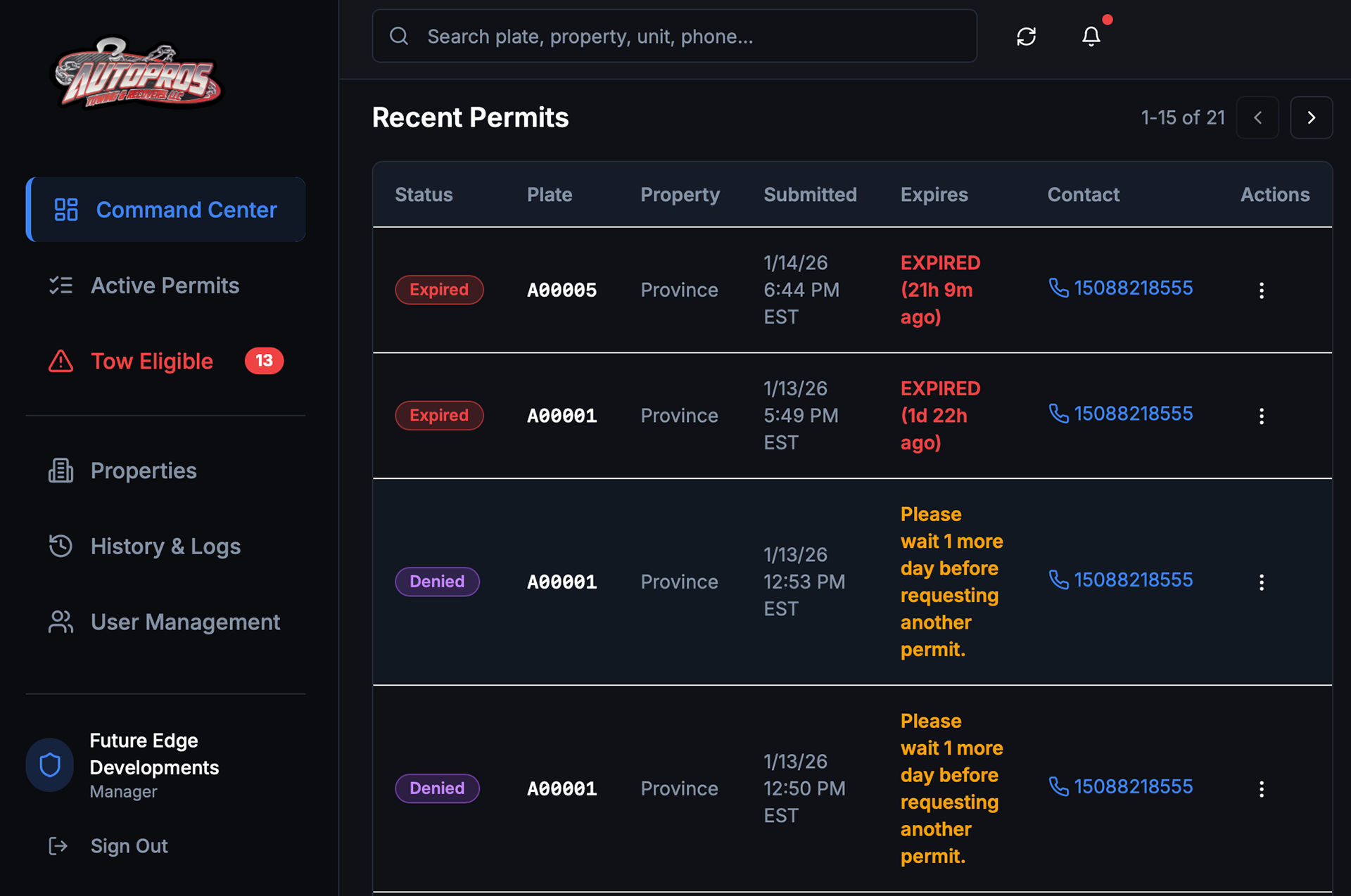 Designed a guest parking permit workflow that tracks permits end-to-end, calculates expirations automatically, and improves towing prioritization. Built a “source of truth” structure in a database (Property Rules, Active Permits, Expired Permits), including rule enforcement logic (permit duration, max days per month, minimum days between visits) and clean audit trails for approvals/denials. The system also supports operational messaging by including expiration timestamps in notifications so tow drivers can prioritize vehicles based on how long a permit has been expired.